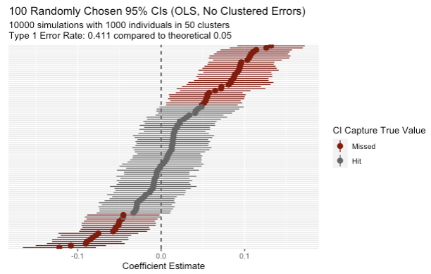 You’d have much less confidence in this estimate now, right? Let’s walk through a simulation to show what happens when we don’t properly account for this clustering of data. We will generate a bunch of data and then run linear regression to find the coefficient estimate. Imagine we’re evaluating the a tutoring program on test scores. The true value of the intervention is 0…but is that what we find?